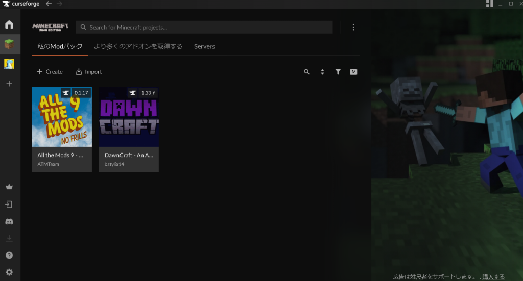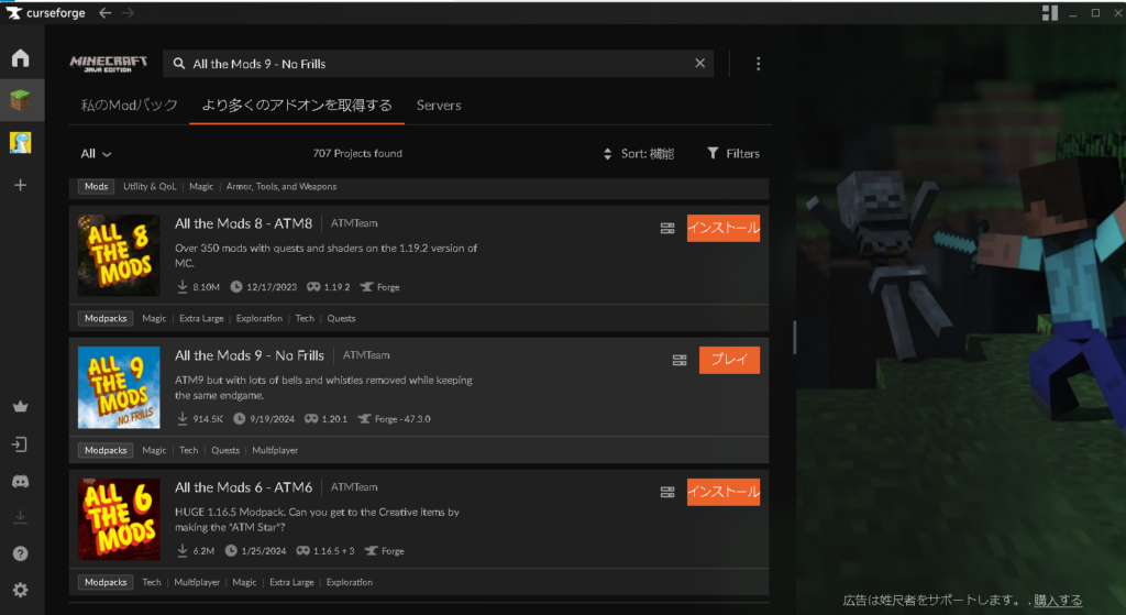 次にカースフォージでAll the Mods 9 – No Frillsをインストールする方法を解説します。